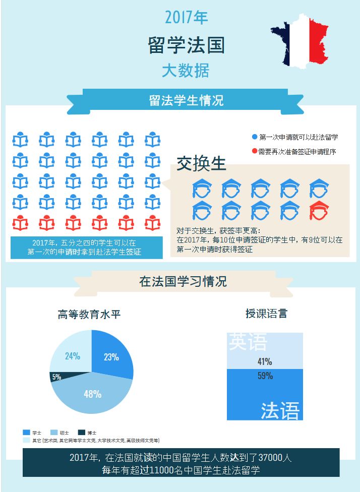 • 簡化簽證:近年來法國留學(xué)簽證政策得到大幅優(yōu)化,五分之四的中國學(xué)生在首次申請簽證時(shí)即可順利獲得。