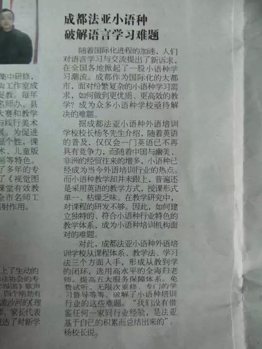 今天如果你恰好打開了2015年10月16日的《環(huán)球時報》,就會驚喜的發(fā)現(xiàn),成都法亞小語種培訓學校的名字赫然在目,在這篇名為《成都法亞小語種,破解語言學習難題》的文章里,介紹了目前小語種教育行業(yè)的背景,以及法亞在此過程中先進的教學理念,靈活的授課方式,成都法亞已經(jīng)成為名副其實的成都小語種培訓最優(yōu)品牌,下面,就跟隨小編去看一下今天的《環(huán)球時報》吧。