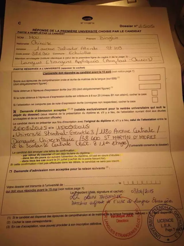 這一別都快一年了,前不久聽說她被格勒諾布爾第三大學(xué)(Université Stendhal)的LEA專業(yè)錄取,真的很替她高興,相信這是一個好的開始,以后她會用自己的這份執(zhí)著為我們見證不一樣的奇跡。