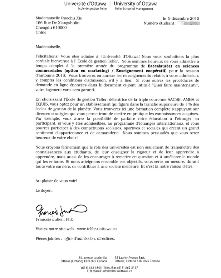 渥太華大學(xué)工商管理系的offer,簡(jiǎn)直棒棒噠~~