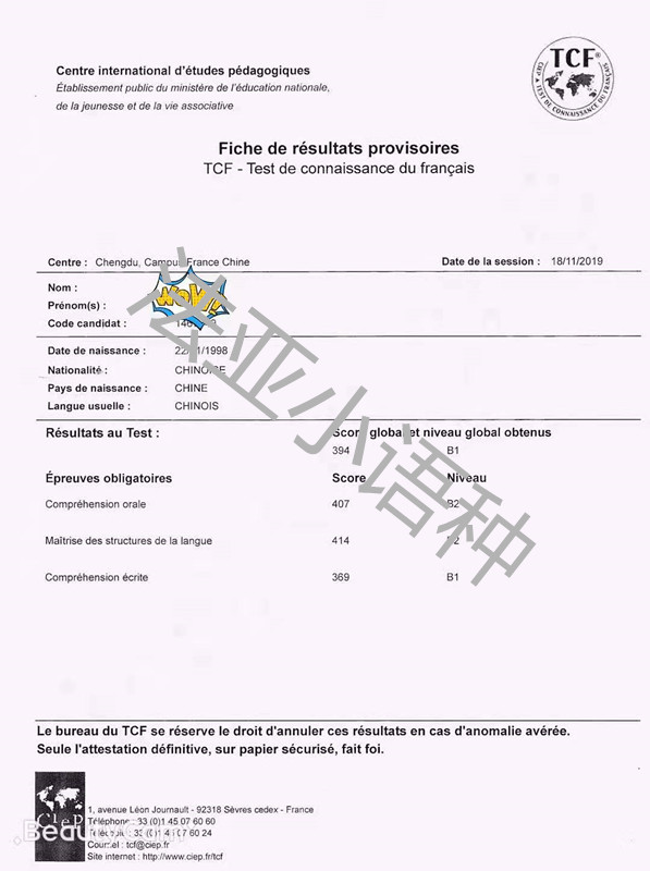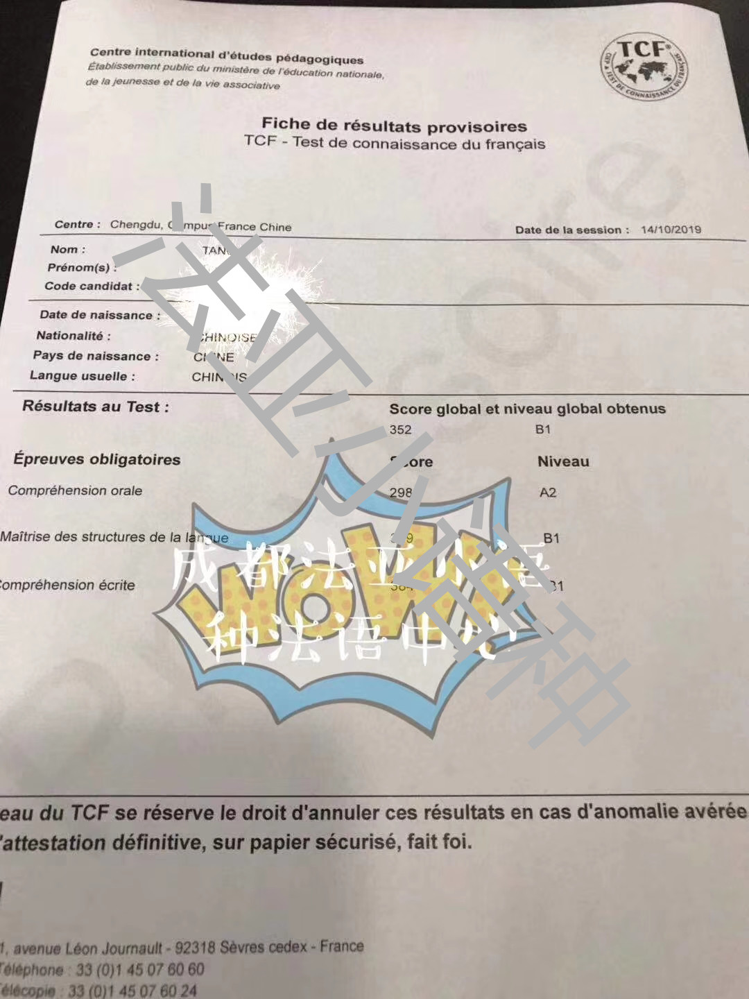 考試類型:TCF所報(bào)課程:法語出國班法語唐同學(xué)喜獲TCF B1成績(jī)