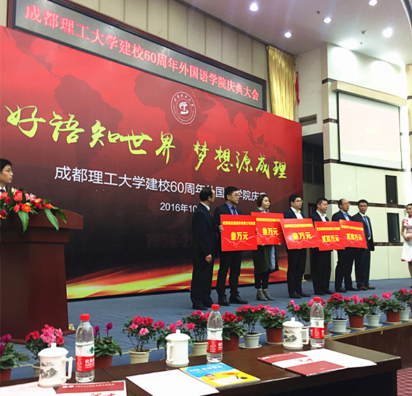 上周五,10月14號,我校代表楊老師應(yīng)邀參加了成都理工大學(xué)的建校60周年紀(jì)念會,并捐助人民幣3萬元給成都理工大學(xué)外語學(xué)院,用于同學(xué)們學(xué)習(xí)外語以及留學(xué)項目。