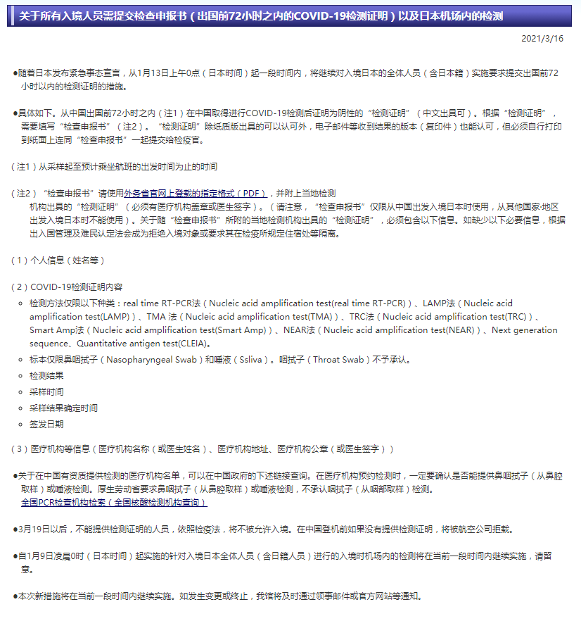 針對出國前72小時以內的檢測證明,大使館于3.16發(fā)布了《關于所有入境人員需提交檢查申報書(出國前72小時之內的COVID-19檢測證明)以及日本機場內的檢測》的通知,全文內容如下: