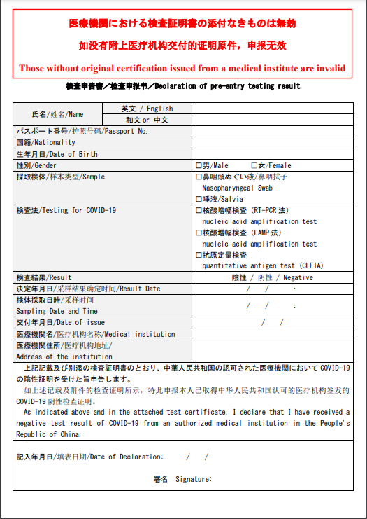 (注2)“檢查申報書”請使用外務省官網上登載的指定格式(PDF),并附上當地檢測機構出具的有醫(yī)療機構蓋章或醫(yī)生簽字“檢測證明”。