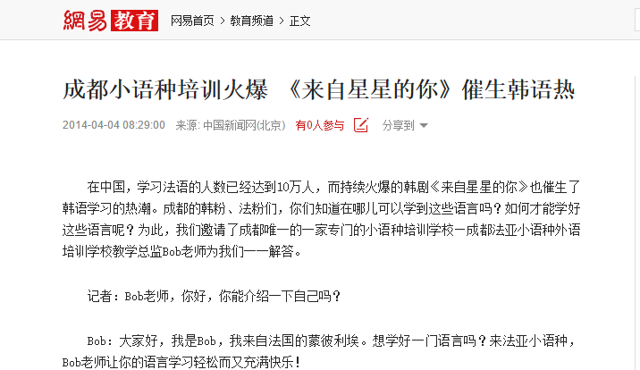 在中國,學(xué)習(xí)法語的人數(shù)已經(jīng)達到10萬人,而持續(xù)火爆的韓劇《來自星星的你》也催生了韓語學(xué)習(xí)的熱潮。成都的韓粉、法粉們,你們知道在哪兒可以學(xué)到這些語言嗎?如何才能學(xué)好這些語言呢?為此,我們邀請了成都唯一的一家專門的小語種培訓(xùn)學(xué)?!啥挤▉喰≌Z種外語培訓(xùn)學(xué)校教學(xué)總監(jiān)Bob老師為我們一一解答。