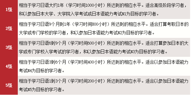 ※上述的出題基準(zhǔn)大體上與“日本語(yǔ)能力考試”的出題基準(zhǔn)一致。詳細(xì)的出題基準(zhǔn)收錄于專門教育出版社發(fā)行的《1萬(wàn)詞匯分類集》、《詞匯漢字基準(zhǔn)表》。