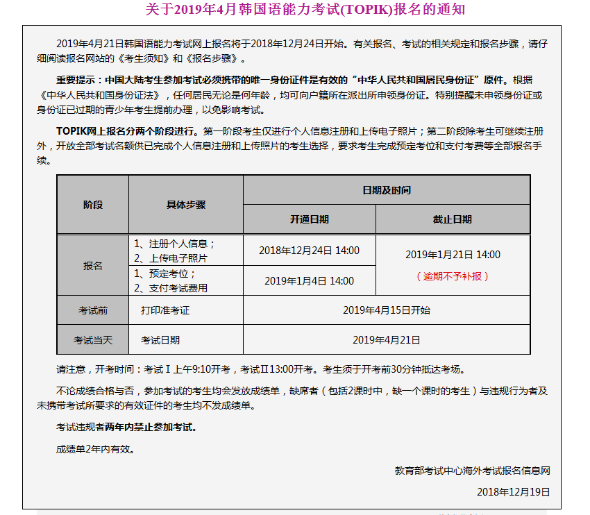 2019年4月韓國(guó)語(yǔ)能力考試TOPIK考試時(shí)間