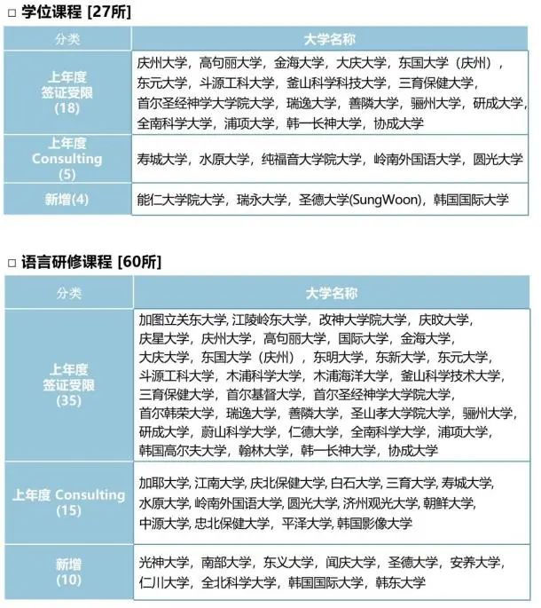 2015年3月,韓國開始實行認(rèn)證大學(xué)簽證簡化手續(xù),每年都會公布一份當(dāng)年的最新簽證受限大學(xué)名單和優(yōu)秀認(rèn)證大學(xué)名單,由于名單存在變動,因此每年都會有一些學(xué)校加入認(rèn)證大學(xué)名單中了,也會有一些大學(xué)被從認(rèn)證大學(xué)名單中去除。