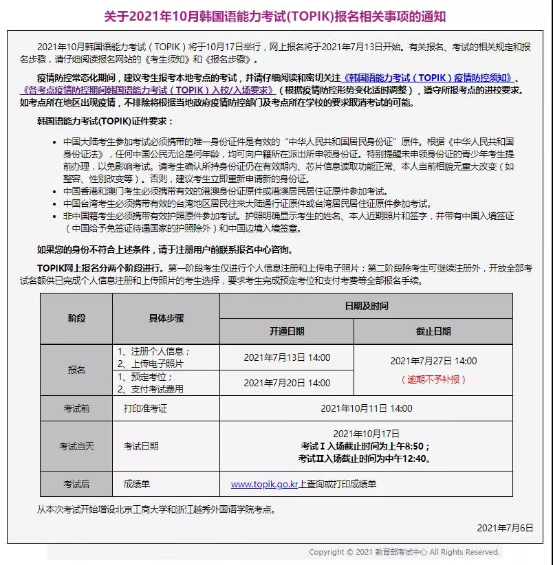 昨天,官方公布最新資訊,確定76屆TOPIK中國大陸考試日程發(fā)布《關于2021年10月韓國語能力考試(TOPIK)報名相關事項的通知》,通知內容如下: