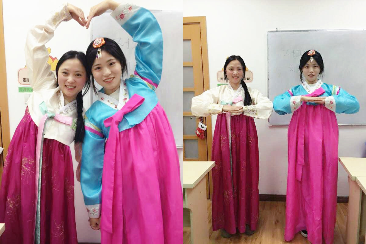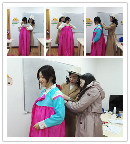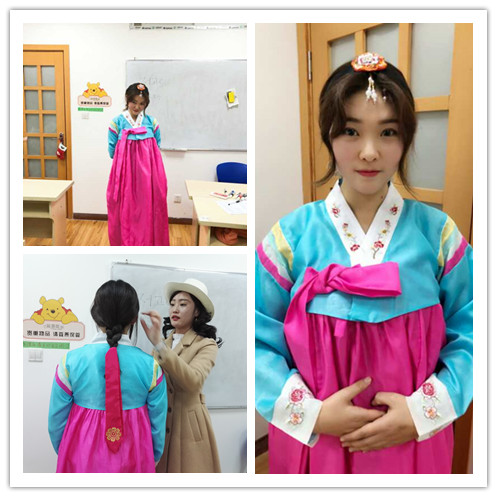 這次展示課,周敏老師還邀請了韓語外教老師,在外教老師的幫助下,同學(xué)們更加身臨其境了。一起感受了不一樣的韓服和韓國禮儀。