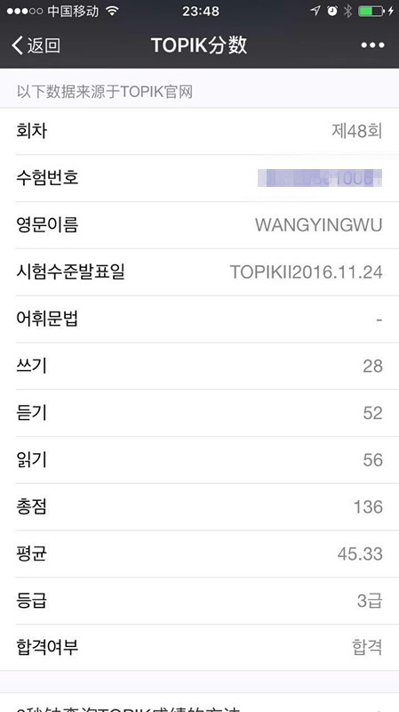韓國學(xué)員成績