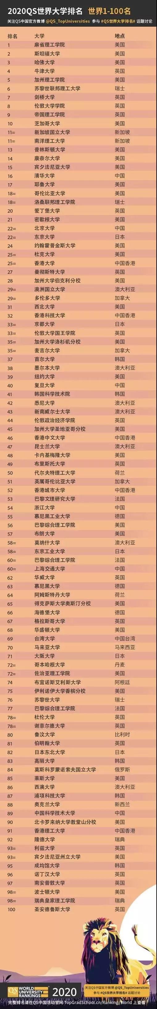 2020 QS世界大學(xué)排名TOP100