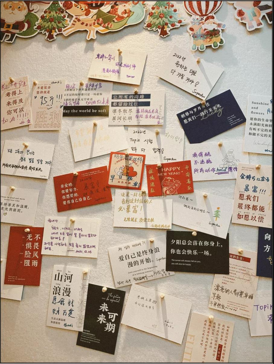 在轉(zhuǎn)角的榮譽墻中,出現(xiàn)了一面不一樣的愿望墻。校區(qū)老師們精心挑選了不重樣的賀卡,邀請往來的同學(xué)們留下你未完成,或是期待已久的心愿,帶著這些美好的期待,上墻向著嶄新的一年出發(fā)。?